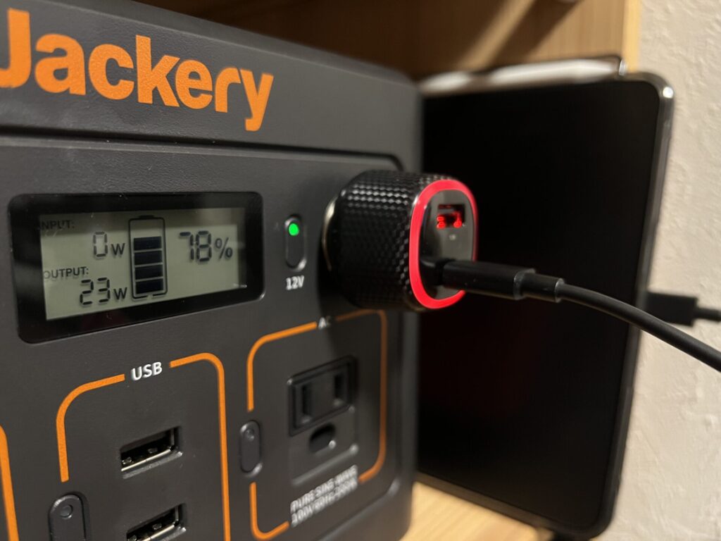 Jackeryを購入してから長いことシガーソケットは使えていなかったのですが、このELECOMのシガーチャージャーを導入したおかげで、Jackeryをフル活用できるようになりました。