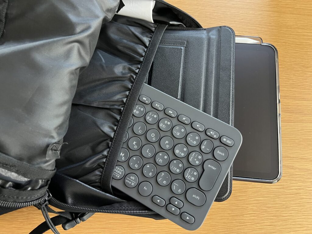 15インチのパソコンが入る背面ポケットがあるので、iPadやキーボードも余裕で入ります。