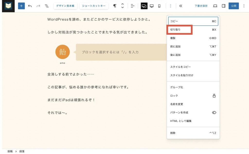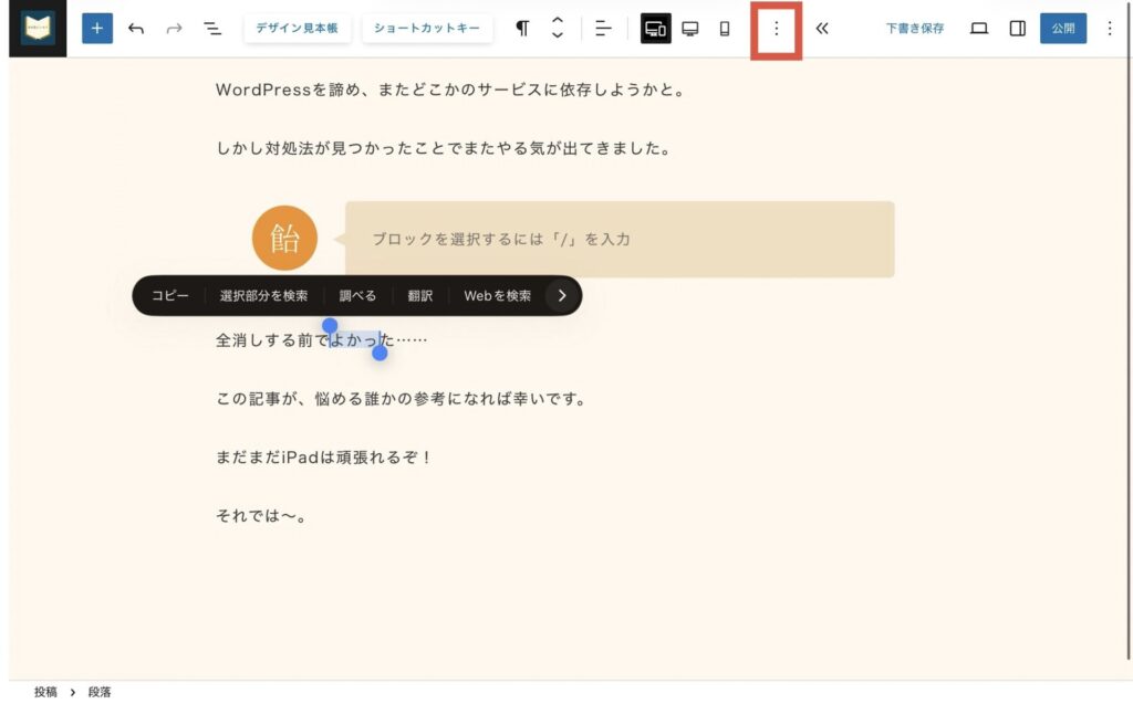 この問題が起きるのはiPad、あるいはiPhoneのビジュアルエディターのみ。コードエディターはどんなに時間が経っても、編集できなくなるということはありませんでした。