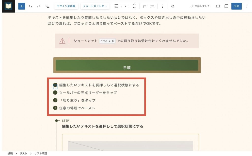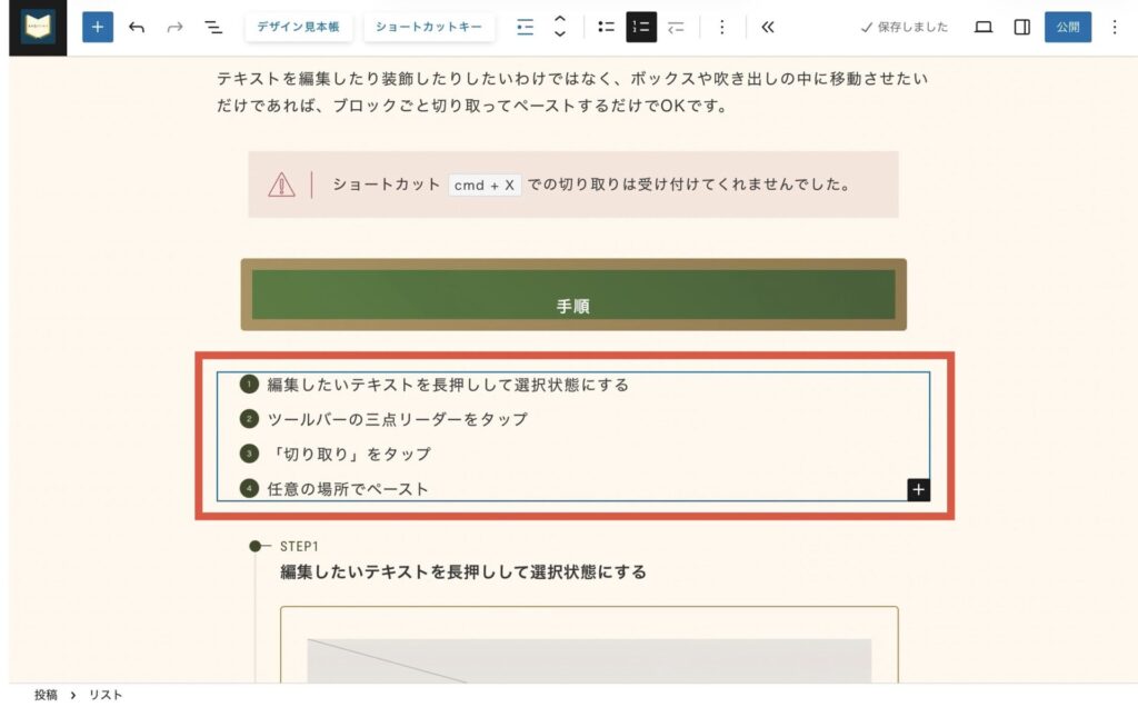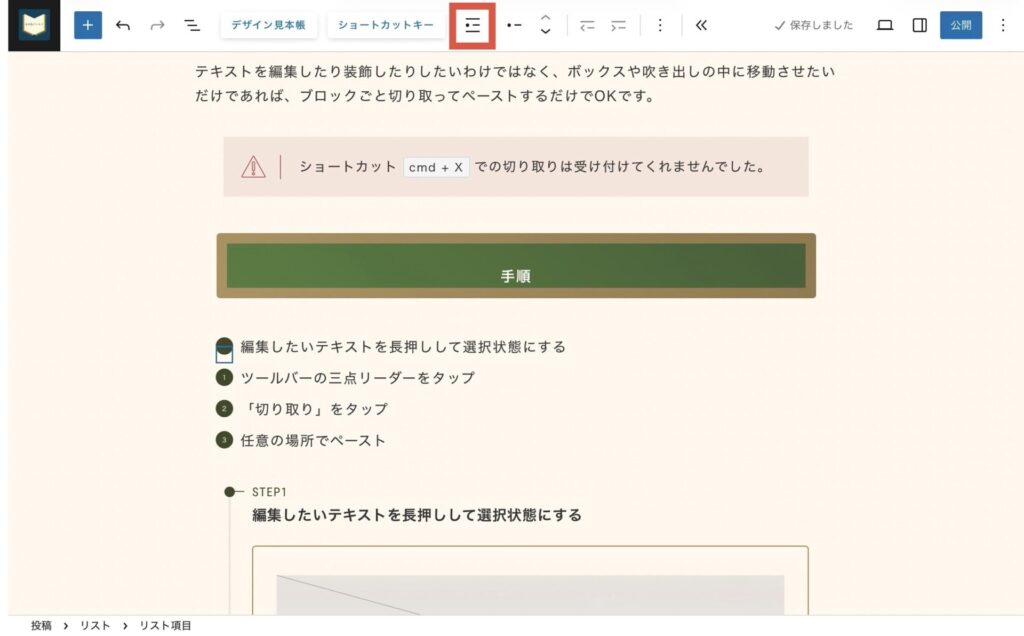 長押しすると1項目だけしか選択されない この状態でツールバーの先頭にあるリストアイコンをタップ 親ブロック(リスト全体)が選択状態になった